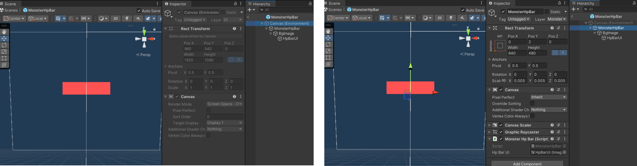 몬스터의 체력 상태를 플레이어에게 보여주기 위해 World Space Canvas를 이용한 체력바 UI를 구현하였다.