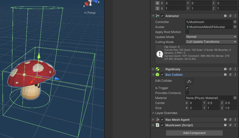 플레이어와의 공격 판정을 위해 BoxCollider 컴포넌트를 추가하고 Is Trigger 옵션을 활성화하였다.