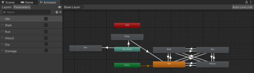 이런식으로 Idle ↔ Run, Walk ↔ Run 도 같은 구조이다.