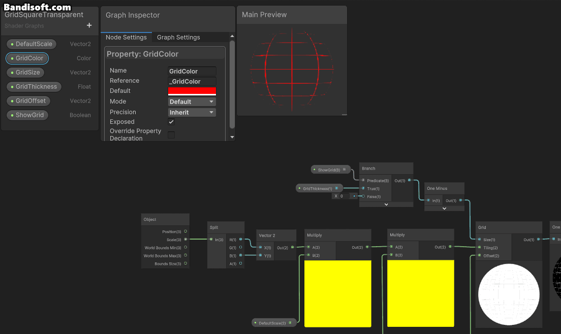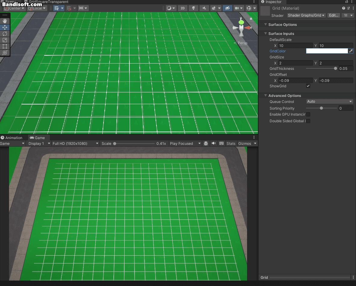 이때, Shader에서 'Shader Graphs > GridSquareTransparent' 를 선택하여, 그리드를 설정하는 Material로 만들어준다.