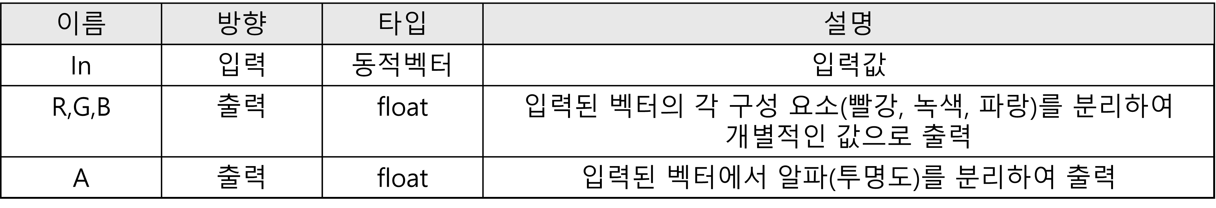 Split 노드는 In입력 벡터를 개별적인 스칼라 값(R,G,B 및 A)로 분리한다.