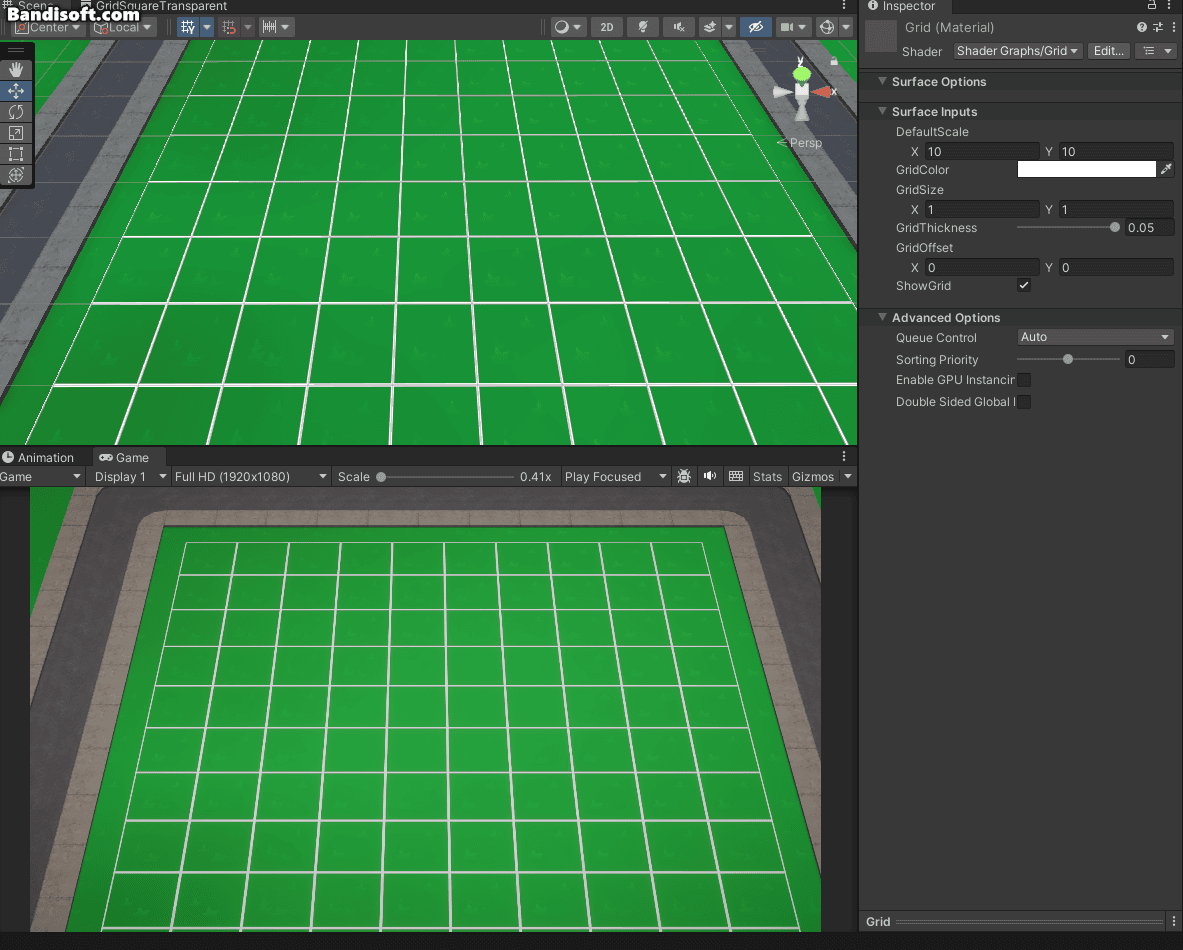 계산된 최종 그리드 크기를 그리드 셰이더의 Tiling 속성에 적용하여, 적절한 타일링 크기를 설정한다.